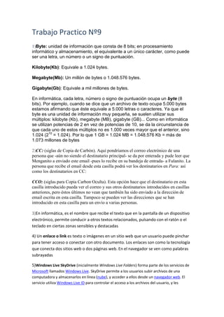 1) El documento define unidades de medida de información como byte, kilobyte, megabyte y gigabyte. Explica que un byte equivale a 8 bits y que cada unidad es 1024 veces mayor que la anterior.