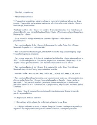 El documento proporciona instrucciones para realizar diversas tareas de formato y edición en PowerPoint, incluyendo insertar y modificar temas, cambiar el fondo de diapositivas, aplicar estilos rápidos, editar la duración de canciones, modificar formato de texto, aplicar sombreado y color a texto, deshacer formato, alinear elementos, cambiar estilos de viñetas y números, imprimir presentaciones, editar imágenes, agregar efectos a imágenes, insertar y editar tablas, combinar y dividir celd