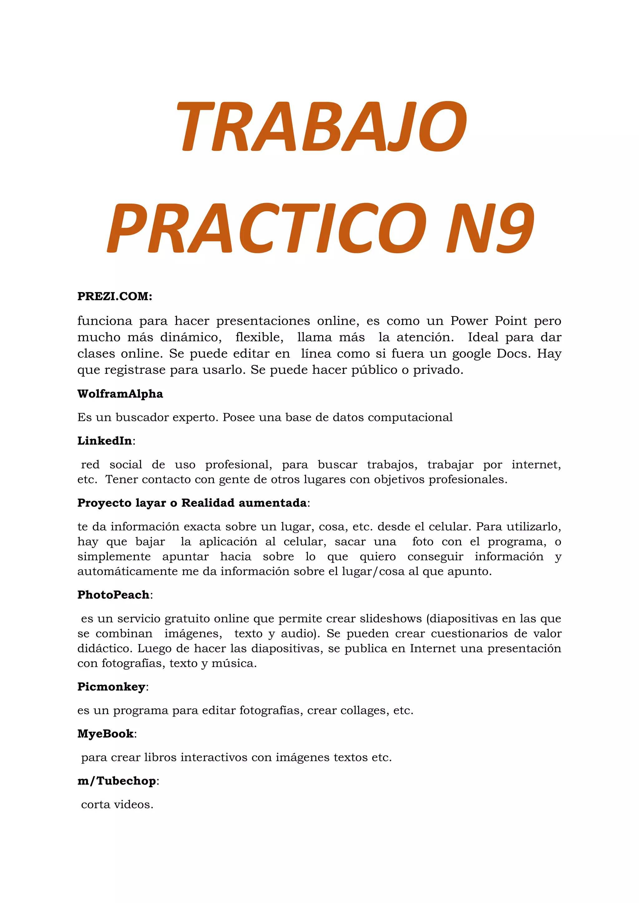 Este documento describe varias herramientas digitales como Prezi y WolframAlpha para presentaciones y búsquedas expertas, respectivamente, así como redes sociales como LinkedIn y herramientas para editar fotos, videos y música como Picmonkey, MTubechop y Grooveshark.