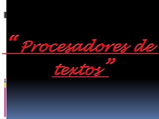 Este documento describe los procesadores de texto, que son aplicaciones informáticas para crear y modificar documentos en una computadora. Explica que permiten formatos de texto, imágenes e inserciones y que los archivos se guardan como documentos. Menciona algunos procesadores de texto comunes como WordPad, Word, OpenOffice y WordPerfect y sus características principales.