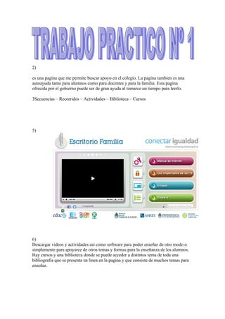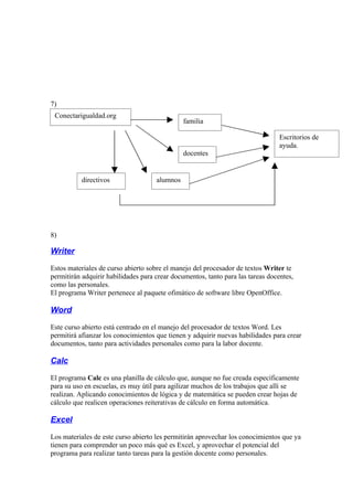 Este documento describe una página web gubernamental que ofrece recursos de apoyo para estudiantes, maestros y familias. La página incluye videos, actividades, software educativo, cursos y una biblioteca en línea con material sobre varios temas. También ofrece cursos abiertos sobre programas de procesamiento de texto como Writer, Word, hojas de cálculo como Calc y Excel para que maestros puedan enseñar de manera más efectiva utilizando tecnología.