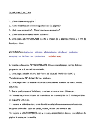 El documento proporciona instrucciones para completar un trabajo práctico que involucra editar y personalizar una página web de Weebly. Instruye al lector sobre cómo agregar y modificar páginas y contenido como imágenes, videos, presentaciones y afiches digitales creados con varias herramientas en línea. El trabajo práctico también incluye instrucciones para descargar e insertar presentaciones de Smilebox y crear contenido en sitios como Glogster y Scrapblog para luego agregarlo a la página web de Weebly.