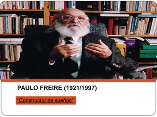 Paulo Freire fue un pedagogo brasileño nacido en 1921 que propuso un método educativo humanista y liberador. Su obra más conocida es "Pedagogía del oprimido". Freire creía que la educación debe partir del contexto cultural e ideológico de los estudiantes y que tanto maestros como estudiantes se educan mutuamente. Su visión era transformar el mundo a través de una educación consciente y crítica que brinde poder y libertad.