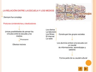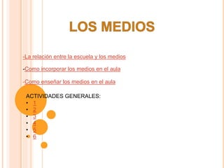 El documento describe cómo incorporar los medios de comunicación en el aula y proporciona algunas actividades generales para trabajar con ellos. Primero, sugiere analizar los medios desde el placer que producen y reflexionar sobre sus emociones y códigos. Luego, presenta tres ejes para trabajar con imágenes en medios: conocimiento, emoción y acción. Finalmente, incluye preguntas orientadoras y temáticas posibles para cada área de conocimiento sobre los medios.