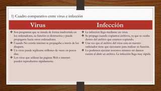Este documento trata sobre los virus de computadora. Explica que los virus son programas dañinos que se instalan sin permiso y se propagan a otras computadoras. Luego, detalla dos formas en que los virus se pueden propagar, a través de correos electrónicos con archivos adjuntos infectados y al descargar archivos desde páginas web no seguras. Finalmente, discute algunos síntomas que indican la presencia de un virus y métodos para eliminarlos como usar un programa antivirus.