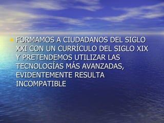 El documento discute la necesidad de integrar mejor la tecnología en la educación. Argumenta que la escuela debe actualizar su enfoque para satisfacer mejor las necesidades de los estudiantes en la era digital. Propone que los ordenadores deben usarse comúnmente en el aula para apoyar actividades colaborativas y creativas, en lugar de simplemente mostrar información. También sugiere que se necesita un cambio metodológico, formación continua para los maestros, y aprovechar el conocimiento técnico de los estudiantes.