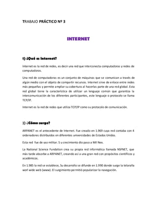 Internet es la red de redes que interconecta computadoras y redes de computadoras globalmente utilizando el protocolo TCP/IP. Surgió de ARPANET, la primera red creada en 1969 por el Departamento de Defensa de EE.UU. para conectar 4 universidades, y evolucionó a través de redes como Milnet y NSFNET hasta convertirse en la red global que conocemos hoy, impulsada por la popularización de la World Wide Web en la década de 1990.