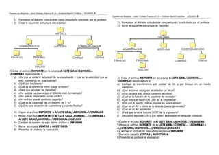 Este documento presenta dos exámenes prácticos sobre el uso del explorador de Windows. Los exámenes incluyen instrucciones para formatear un disquete, crear carpetas y archivos, mover y copiar archivos entre carpetas, y cambiar nombres de archivos. El objetivo es que los estudiantes demuestren su conocimiento sobre la estructura de carpetas y archivos en Windows y cómo manipularlos a través del explorador.
