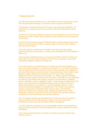 El documento describe varios recursos educativos disponibles en un sitio de educación del gobierno, incluyendo programas para descargar como calculadoras científicas y software de dibujo molecular, así como cursos sobre programas de Office, búsqueda de empleo y técnicas de estudio. También menciona recursos para trabajar con una computadora por alumno e introducir a las familias en el uso de programas y ayudar a los estudiantes con tareas. Finalmente, destaca que los recursos son iguales para docentes y alumnos para que los ma