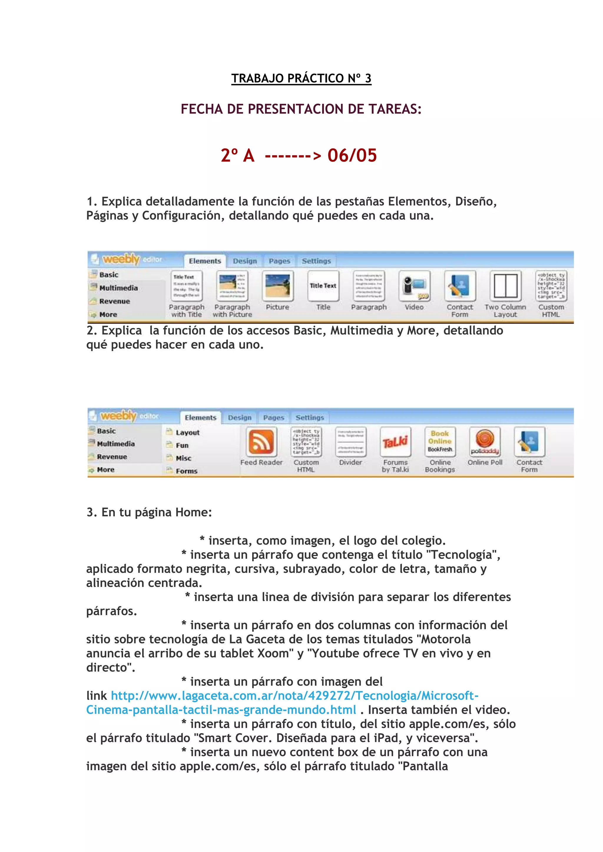 Este documento presenta instrucciones para completar un trabajo práctico en el que se deben crear páginas web utilizando Google Sites. Instruye al lector sobre las funciones de las pestañas Elementos, Diseño, Páginas y Configuración. También explica las funciones de los accesos Básico, Multimedia y Más. Luego, detalla los pasos para insertar texto, imágenes, videos y enlaces en la página de inicio. Por último, solicita crear páginas adicionales sobre fotos, presentaciones, videos,