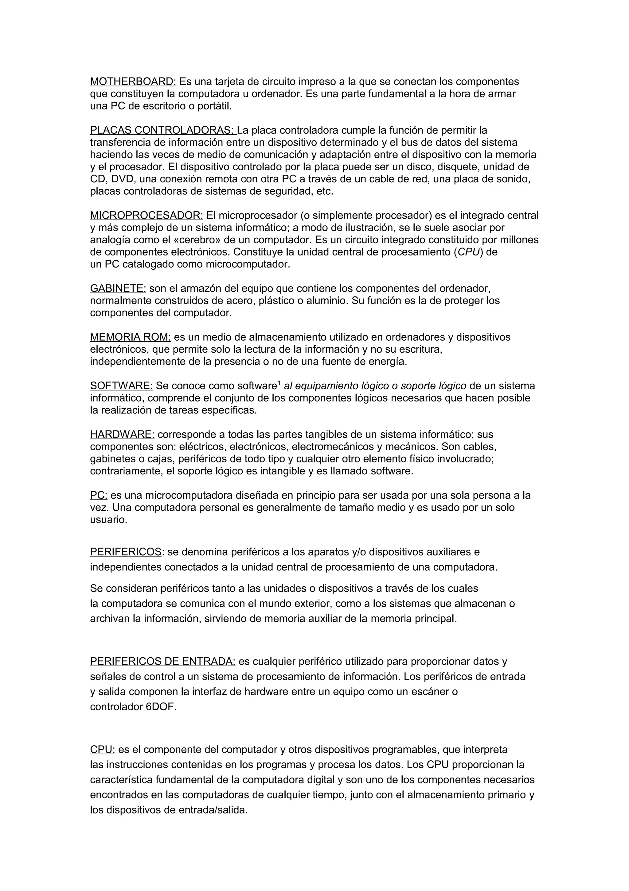 La motherboard es una tarjeta que conecta los componentes de una computadora. Las placas controladoras permiten la transferencia de información entre dispositivos y el sistema. El microprocesador es el componente central que procesa instrucciones. Otros componentes incluyen el gabinete, memoria ROM, software, hardware, monitor y periféricos de entrada/salida como teclado, mouse y unidades de almacenamiento.