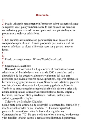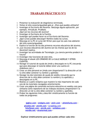 Este documento presenta una serie de tareas relacionadas con el uso de recursos educativos digitales. Incluye instrucciones para completar una evaluación de diagnóstico, explorar el sitio conectarigualdad.gob.ar y descargar aplicaciones y cursos, investigar los escritorios del docente y la familia, y probar varios sitios web para editar imágenes.