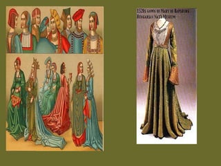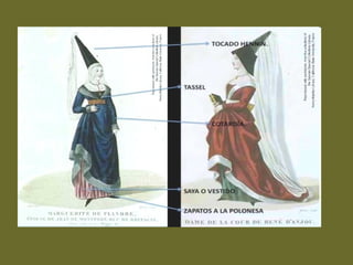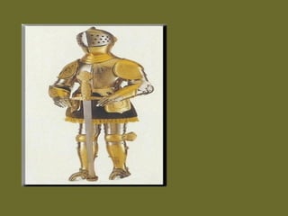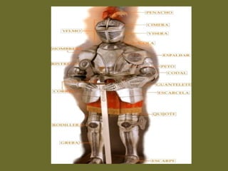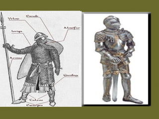 El documento proporciona información sobre la indumentaria y armadura durante la Edad Media. Explica las diferentes prendas de vestir utilizadas por hombres y mujeres de diferentes clases sociales, así como la evolución de las armaduras de caballero a lo largo de la época. También analiza el desarrollo de la moda y las diferencias en la vestimenta entre la nobleza, el clero y los campesinos durante el Medioevo.