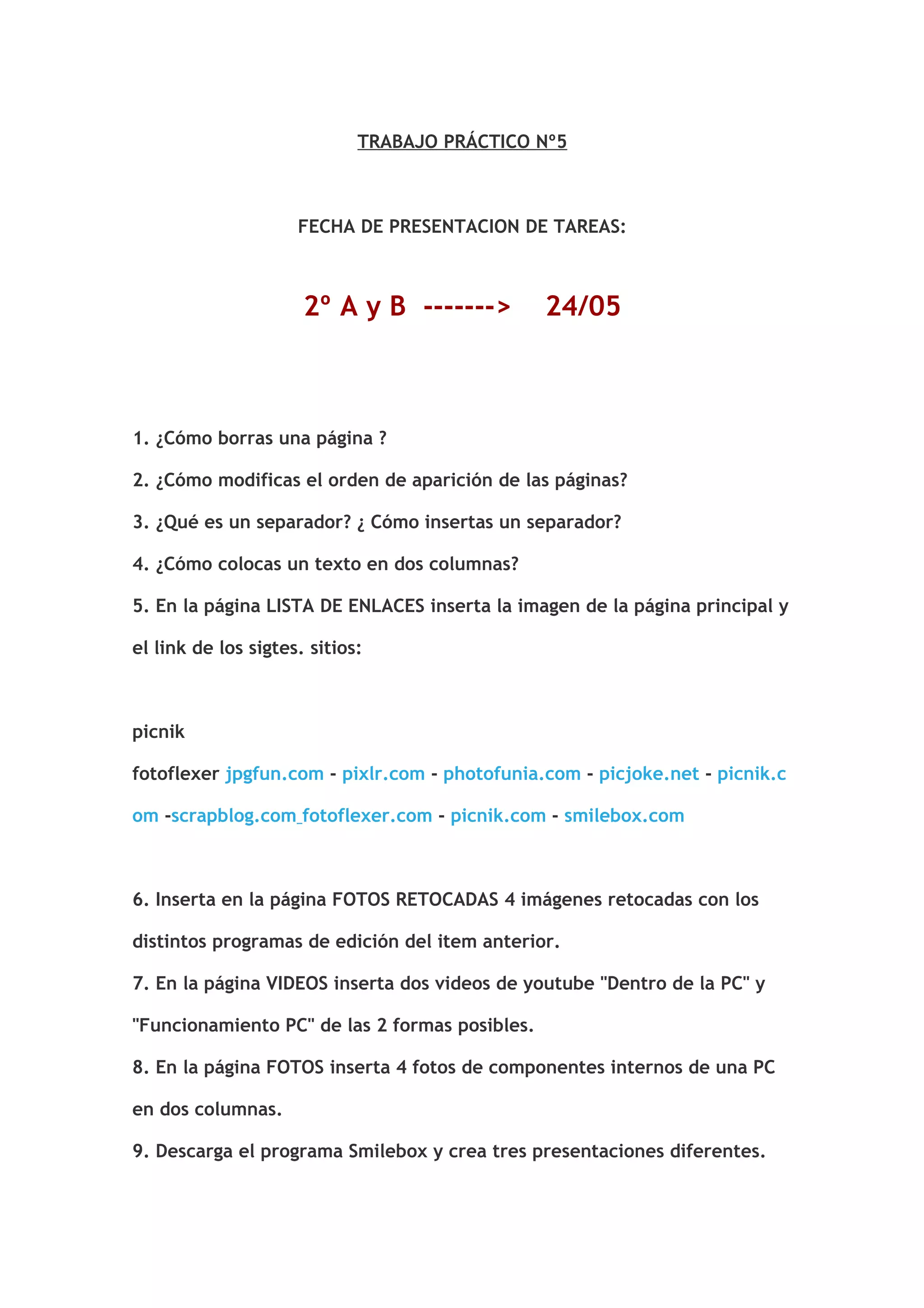 Este documento presenta 12 tareas prácticas relacionadas con la edición y publicación de páginas web para el 24 de mayo. Incluye instrucciones sobre cómo borrar y reordenar páginas, insertar separadores, usar formatos de dos columnas, agregar enlaces e imágenes de sitios web, retocar fotos, insertar videos, y crear presentaciones utilizando programas como Smilebox, Glogster y Scrapblog.