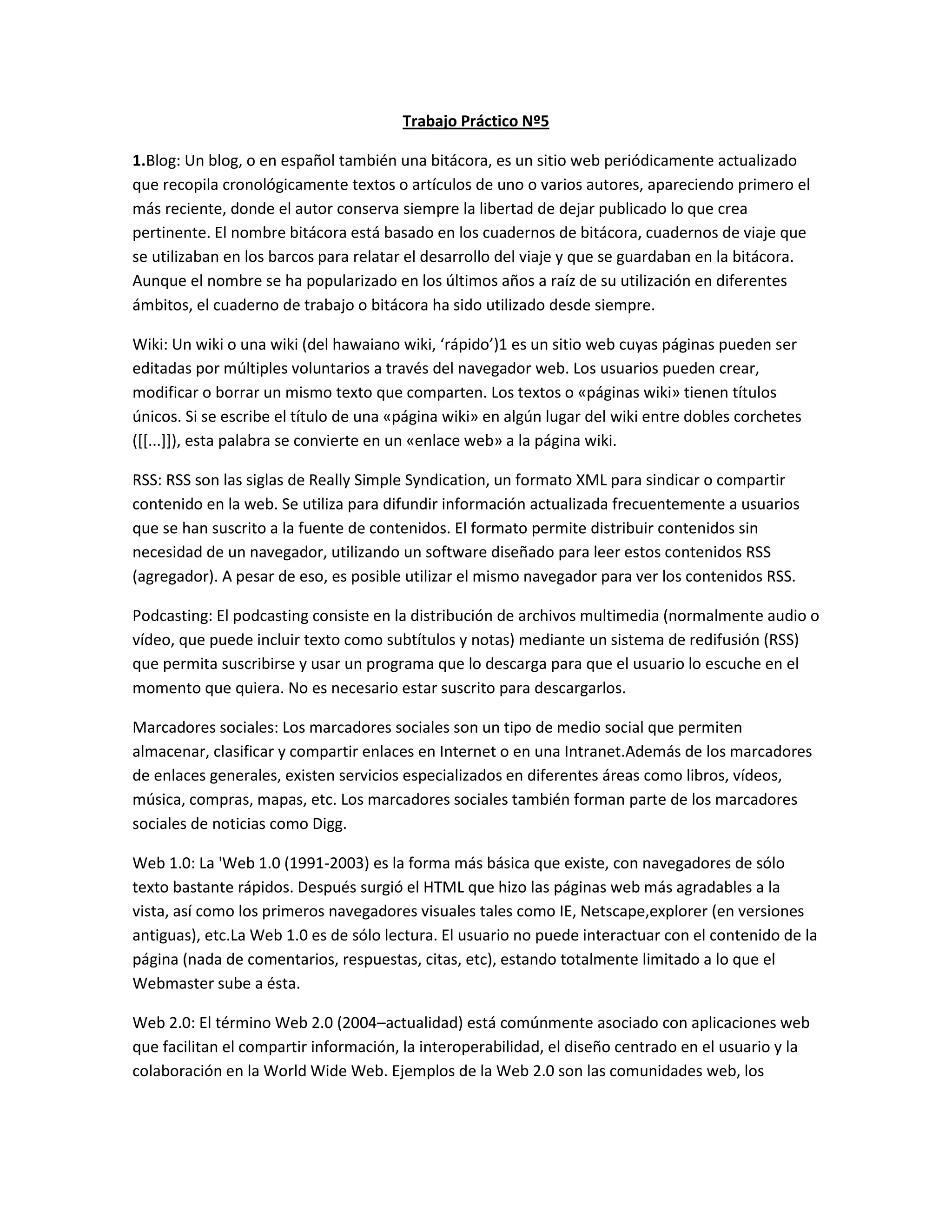El documento proporciona definiciones y explicaciones de varios temas relacionados con la tecnología web como blogs, wikis, RSS, podcasting, marcadores sociales, las versiones 1.0, 2.0 y 3.0 de la web, y varios servicios de Google como Gmail, Google Maps, Google Adsense, Google Adwords y Google Calendar.