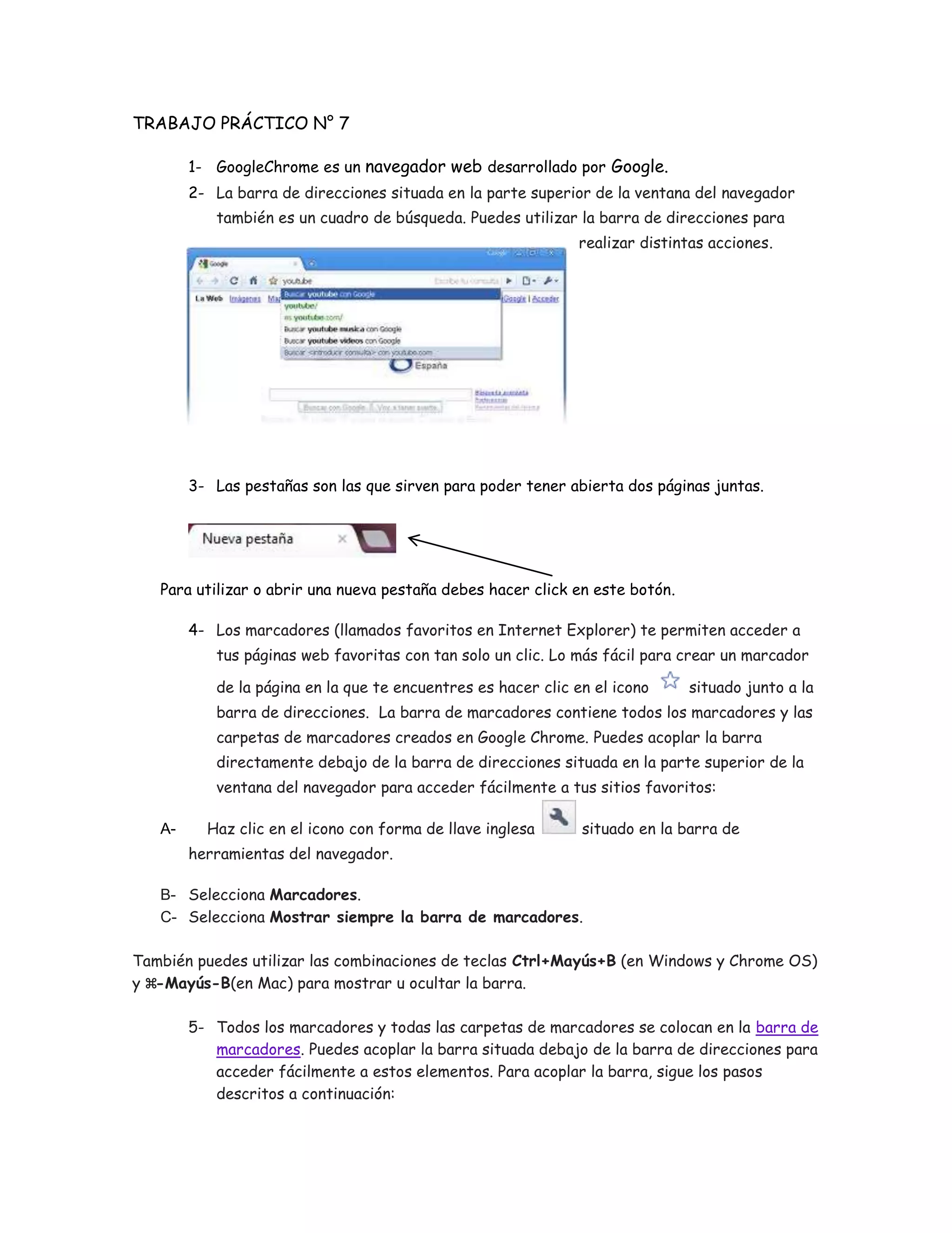 El documento describe las funciones y características del navegador web Google Chrome. Explica cómo usar pestañas, marcadores, la barra de direcciones y la historia. También cubre temas como personalización con temas, doodles de Google y la creación de cuentas de Google.