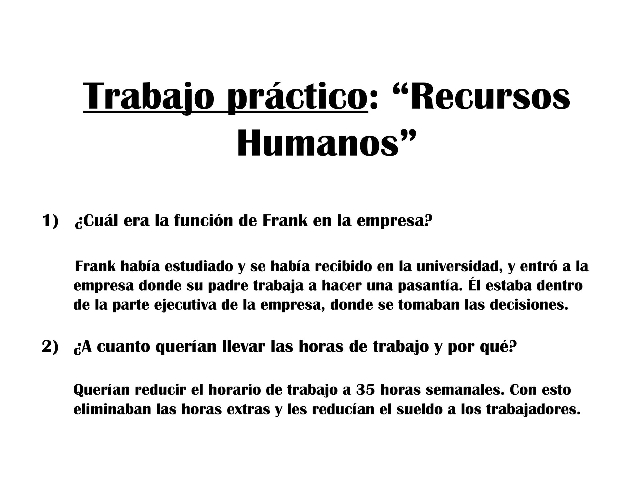 Frank trabajaba en la parte ejecutiva de una empresa donde su padre era obrero. La empresa quería reducir las horas de trabajo semanales de los empleados para eliminar las horas extras y reducir sus salarios, a lo que se oponían los sindicatos y obreros porque perderían ingresos. Frank realizó una encuesta entre los trabajadores para conocer su opinión sobre la medida. Frank y su padre tenían una relación complicada, ya que su padre quería que Frank lograra más de lo que él había podido como obrero.