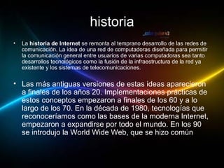 Internet comenzó a desarrollarse en las décadas de 1960 y 1970 a partir de redes de comunicación existentes. En los 1980s, las tecnologías que conocemos como Internet se expandieron por el mundo. En los 1990s se introdujo la World Wide Web, que se popularizó rápidamente. La infraestructura de Internet se extendió globalmente pero también creó una brecha digital en el acceso. Internet transformó la economía mundial e impulsó el crecimiento de las empresas de tecnología.