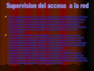 Este documento proporciona instrucciones para configurar de forma segura una red de Microsoft Windows Small Business Server 2003. Entre las tareas recomendadas se incluyen comprobar la topología y configuración de los servidores de seguridad, implementar contraseñas seguras, configurar el acceso remoto de forma segura, y asegurarse de que los usuarios solo tengan los permisos necesarios para realizar su trabajo. El objetivo es proteger la disponibilidad, integridad y confidencialidad de la red local.