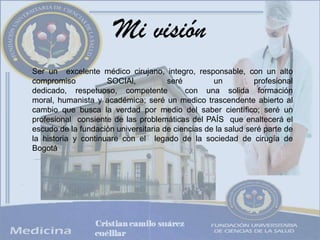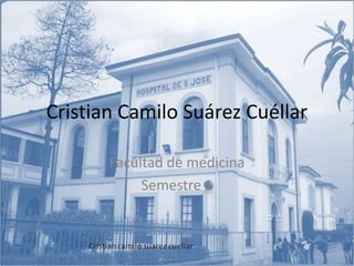 Cristian Camilo Suárez Cuéllar es un estudiante del primer semestre de medicina en la Fundación Universitaria de Ciencias de la Salud. Su visión es ser un excelente médico cirujano pediátrico comprometido con la sociedad y aplicar valores éticos y conocimiento científico. Su misión es especializarse en cirugía pediátrica para contribuir a mejorar la calidad de vida en el país. Actualmente estudia inglés básico en el SENA y recientemente completó un curso sobre control de infecciones hospitalarias.