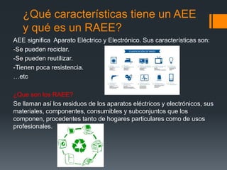 Los RAEE son residuos de aparatos eléctricos y electrónicos que se generan en centros escolares como teclados, ratones e impresoras. Estos deben depositarse en contenedores especiales cercanos como el punto de recogida en Albox, Almería. Es importante reciclar los RAEE para reducir la contaminación y reutilizar los aparatos, beneficiando así el medio ambiente.