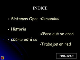 El documento resume el sistema operativo MS-DOS, incluyendo su historia desde 1981 hasta 1997, sus funciones principales como coordinar hardware y gestionar archivos y errores, su estructura de comandos externos e internos, y que fue creado originalmente como QDOS para ser luego vendido como PC-DOS e MS-DOS.