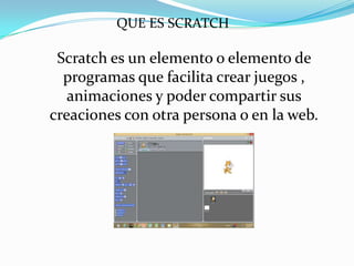 Este documento proporciona una introducción a Scratch, incluyendo sus componentes principales como objetos, escenarios, bloques de programación, disfraces y formatos de archivos compatibles. Explica que Scratch permite crear juegos, animaciones y compartir creaciones en línea mediante el uso de objetos que se pueden programar y personalizar con disfraces diferentes. También define conceptos como algoritmos y los símbolos utilizados en ellos.