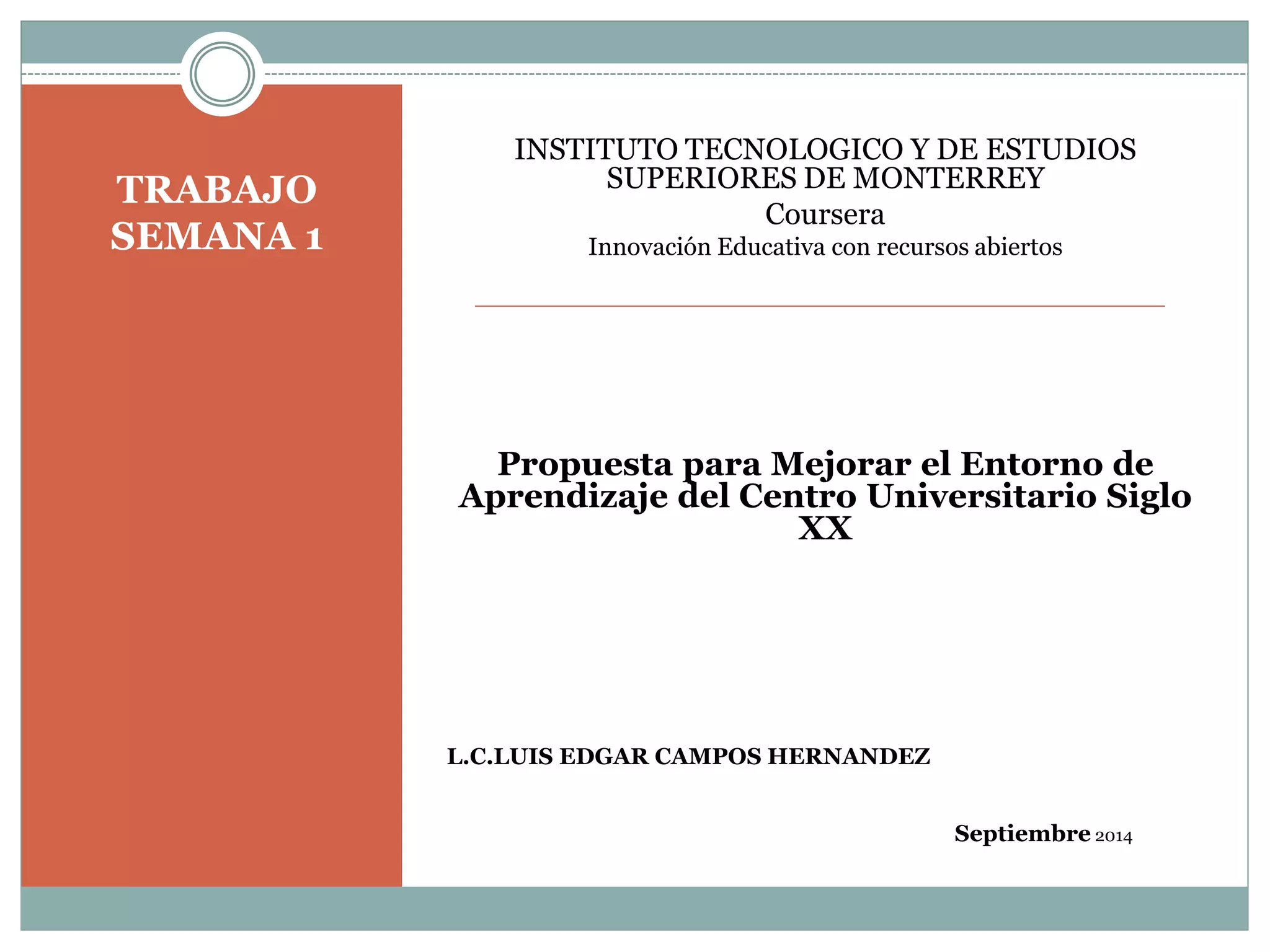 Este documento propone mejorar el entorno de aprendizaje del Centro Universitario Siglo XX mediante el uso de tecnologías de información y comunicación. Actualmente, la universidad cuenta con una plataforma virtual limitada y entornos educativos tradicionales con poco apoyo tecnológico. La propuesta busca ampliar la cobertura de la plataforma a todas las carreras, implementar herramientas como blogs, wikis y redes sociales, y desarrollar aplicaciones móviles para facilitar la interacción entre estudiantes y prof