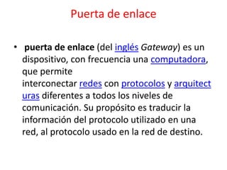 El documento presenta información sobre puertas de enlace, direcciones IP, routers y máscaras de subred. Explica que una puerta de enlace permite interconectar redes con diferentes protocolos y que existen dos tipos principales: IP-PBX y PBX separada con puerta de enlace IP. También define conceptos como direcciones IP fijas, dinámicas, locales y remotas, y describe las funciones de los routers y máscaras de subred.