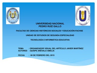 Este documento presenta un resumen del artículo "Organizador visual del artículo" de Javier Martínez realizado por Amelia Quispe Arévalo para la Facultad de Ciencias Históricos Sociales y Educación de la Universidad Nacional Pedro Ruiz Gallo.