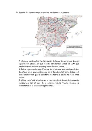 Este documento presenta 16 preguntas sobre temas relacionados con la geografía de España. Las preguntas cubren temas como la inversión en I+D, la red de transporte en España incluyendo carreteras, puertos y aeropuertos, la evolución del transporte terrestre y aéreo, la distribución de la actividad terciaria y el turismo, la densidad de población y la evolución de las tasas de natalidad y mortalidad. El documento analiza factores económicos, sociales y geográficos que han