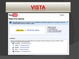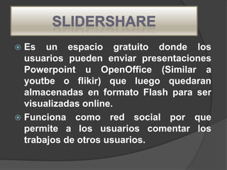 El documento describe diversas herramientas y plataformas en línea como un espacio gratuito para compartir presentaciones y videos, una red social para la publicación de contenido y una serie de blogs. También menciona la popularidad de los wikis, menciona la creación de blogs de diferentes tipos y resalta la importancia de herramientas como Windows Movie Maker y las características de redes sociales como Facebook. Se enfatiza la facilidad de uso y acceso a estas plataformas por parte de los usuarios al requerir simple inscripción o el uso de cuentas de correo electrónico.