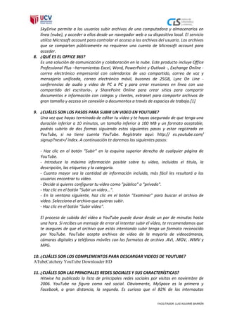 Este documento contiene 20 preguntas sobre diversos temas relacionados con las Tecnologías de la Información y la Comunicación (TICs). Las preguntas abarcan conceptos como software libre, aplicaciones para convertir archivos, redes sociales, Google Docs, YouTube y hashtags en Twitter. El objetivo es que el estudiante busque la información en Internet y responda cada pregunta en un archivo de Word.