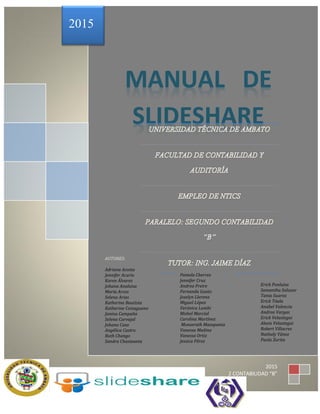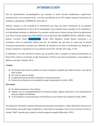 Slideshare es una plataforma web que permite a los usuarios subir, compartir y ver presentaciones en formato de diapositivas. Los usuarios pueden subir presentaciones en formatos como PowerPoint, PDF y documentos de Word. Slideshare se ha convertido en una gran comunidad online para compartir conocimiento a través de presentaciones visuales de manera gratuita.