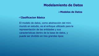 Este documento describe los conceptos básicos del modelamiento de datos, incluyendo los tres tipos principales de modelos de datos, las nociones de modelamiento como el modelamiento entidad-relación, los diagramas de flujo de datos y las matrices de cruce. También explica conceptos clave del modelo entidad-relación como entidades, atributos, relaciones, cardinalidad y representación gráfica.
