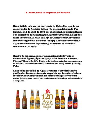 Bavaria S.A. fue fundada en 1889 en Colombia y es actualmente la mayor cervecería del país. Se formó a través de la fusión de varias cervecerías regionales. En 2005, Bavaria se fusionó con SABMiller y actualmente pertenece a ese grupo empresarial. Bavaria produce y distribuye varias marcas de cerveza como Águila, Club Colombia y Costeña, así como otras bebidas como Pony Malta y Pola.