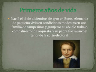 Ludwig van Beethoven nació en Alemania en 1770 y creció en una familia de músicos. A los 21 años comenzó a perder la audición. A pesar de quedar completamente sordo, continuó componiendo obras maestras como su Quinta Sinfonía. Beethoven murió en 1827 debido al exceso de plomo en sus medicamentos.