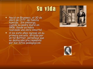 Este documento describe la vida y obras de Carl Friedrich Gauss, un matemático alemán. Nació en 1777 en una familia humilde y demostró habilidades matemáticas desde una edad temprana. A los 10 años sorprendió a sus maestros resolviendo un problema matemático rápidamente. Más tarde, a los 19 años, descubrió teoremas importantes en teoría de números y álgebra. Sus contribuciones a las matemáticas incluyeron campos como teoría de números, astronomía, magnetismo y geometría. F