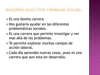 La carrera permite ayudar con problemas sociales, investigar más allá de los problemas e explorar diversos campos laborales mientras se aprenden cosas nuevas diariamente en una profesión en constante desarrollo.