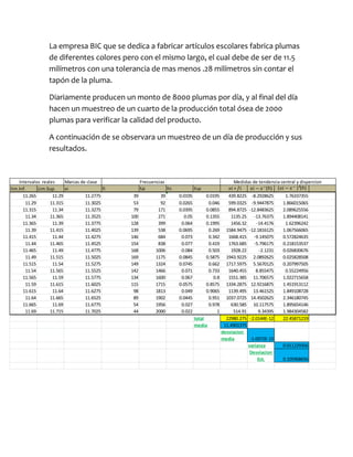 Este documento presenta los resultados de un muestreo de 2000 plumas fabricadas por la empresa BIC. El muestreo midió el largo de cada pluma y agrupó los resultados en intervalos de 0.05 milímetros. Calculó medidas estadísticas como la media, desviación estándar y límites de especificación para verificar que el largo de las plumas cumplía con los estándares de calidad. Los resultados mostraron que la longitud de las plumas se distribuyó normalmente entre 11.22 y 11.77 milímetros, cumpliendo con los límites requeridos
