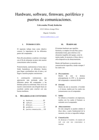 Este documento describe las principales partes de un computador, incluyendo el hardware, software, firmware, periféricos y puertos de comunicación. Explica que el hardware se refiere a los componentes físicos como la CPU, memoria y discos duros. El software son las instrucciones que permiten la comunicación entre dispositivos. El firmware contiene instrucciones grabadas en la memoria ROM. Los periféricos como teclados, monitores e impresoras se conectan al computador. Finalmente, los puertos de comunicación permiten el inter