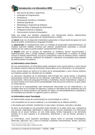 El documento introduce los conceptos fundamentales de la informática. Define la informática como el tratamiento automático y racional de la información por medio de computadoras. Explica que la informática es una ciencia, ingeniería y tecnología que estudia los procesos de captura, procesamiento y presentación de información. También describe las principales áreas de conocimiento de la informática y las carreras a nivel nacional relacionadas con esta disciplina.