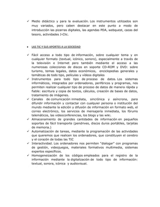 El documento define las siglas TIC como Tecnologías de la Información y Comunicaciones. Explica que las TIC son herramientas para procesar, sintetizar y presentar información de forma variada, incluyendo informática, internet y telecomunicaciones. También describe las funciones educativas de las TIC, sus ventajas e inconvenientes en diferentes ámbitos, y el marco legal de las TIC en Venezuela.