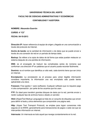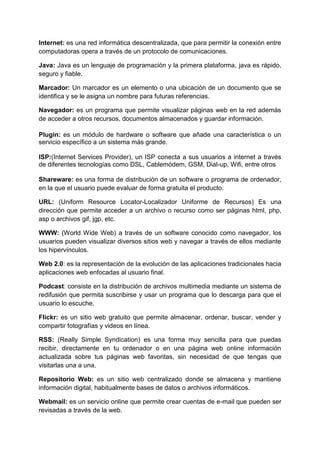 Este documento define y explica brevemente varios términos técnicos relacionados con Internet y la World Wide Web. Algunos de los términos explicados incluyen dirección IP, ancho de banda, copia de seguridad, DNS, dominio, encriptación, FTP, HTML, HTTP, internauta, Internet, Java, marcador, navegador, plugin, ISP, URL, WWW, Web 2.0, podcast, Flickr, RSS, repositorio web y webmail. El documento también proporciona tres formas de insertar el símbolo @ en un
