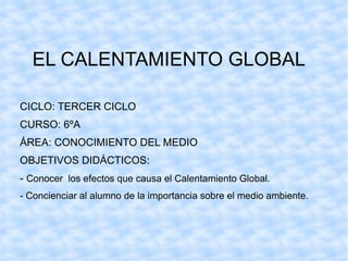 El documento describe los efectos del calentamiento global en la Tierra, incluyendo el deshielo de los polos y glaciares, la subida del nivel del mar, sequías e inundaciones más frecuentes, y la posible extinción de especies. Explica que aunque el calentamiento global puede ser un fenómeno natural, las actividades humanas como la deforestación y quema de combustibles fósiles lo están acelerando, poniendo en riesgo el futuro de la humanidad. Insta al lector a ayudar cuidando el medio ambiente a través