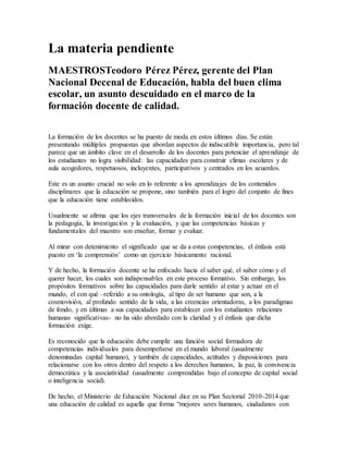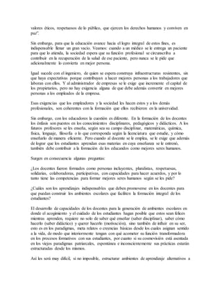 El documento discute la importancia de desarrollar las capacidades de los docentes para crear climas escolares acogedores, respetuosos e inclusivos. Actualmente, la formación de docentes se enfoca principalmente en los conocimientos disciplinares y pedagógicos, descuidando el desarrollo de habilidades socioemocionales. Esto crea una brecha entre las expectativas de la sociedad de que los docentes formen estudiantes con valores éticos y las competencias reales de los docentes. Se necesita enfocar más la formación docente en influir