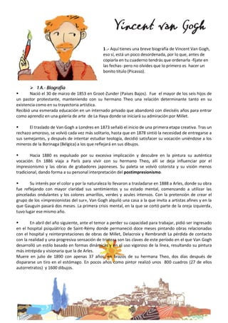 1. Vincent Van Gogh nació en 1853 en los Países Bajos y mostró interés por el arte desde joven. Trabajó como aprendiz de galería y luego se dedicó a la teología y al ministerio antes de dedicarse por completo a la pintura en 1880.