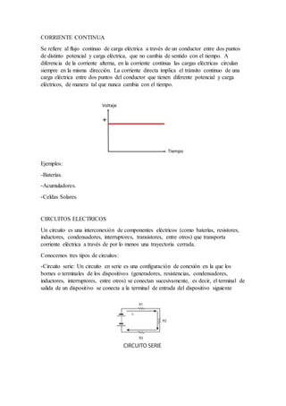 La electricidad se manifiesta a través de varios fenómenos como la carga eléctrica, el campo eléctrico y la corriente eléctrica. Existen dos tipos principales de corriente eléctrica: la corriente alterna, cuya magnitud y sentido oscilan cíclicamente de forma senoidal, y la corriente continua, que fluye en una sola dirección. Los circuitos eléctricos transportan la corriente a través de componentes como baterías y resistencias conectados en serie, paralelo o de forma m