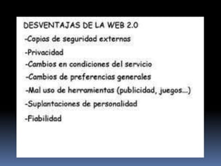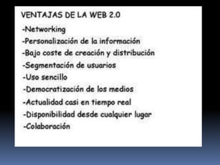 El documento define la Web 2.0 como aplicaciones web que facilitan el compartir información y la colaboración entre usuarios, permitiendo que estos sean creadores de contenido en lugar de meros observadores. Describe algunas características clave como que la web es una plataforma, funcional, simple, ligera, social y participativa. También menciona algunas de las redes sociales más populares y sus números de usuarios.