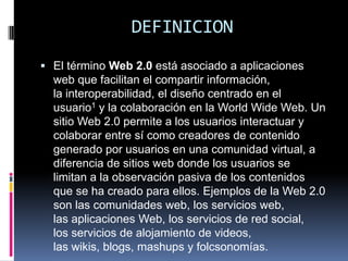El documento define la Web 2.0 como aplicaciones web que facilitan el compartir información y la colaboración entre usuarios, permitiendo que estos sean creadores de contenido en lugar de meros observadores. Describe algunas características clave como que la web es una plataforma, funcional, simple, ligera, social y participativa. También menciona algunas de las redes sociales más populares y sus números de usuarios.